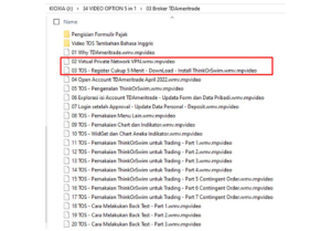 | Software | . Rekomendasi menggunakan Win 10 atau Win 11 . Perhatikan Email Security , Email Recovery , 2FA (two factor authentication) _Google Authenticator . Power option = Never Sleep . Windows UpDates – Pending Updates . Windows Start Button . Setting Multi Monitor . VPN (virtual private network) . Browser Edge, Opera, Google Chrome . Internet Security ( antivirus ), Block/UnBlock FireWall . LightShot Screen Shot . Adobe PDF reader . WinRAR / WinZip . AnyDesk atau Team Viewer untuk Remote Access . Sleep Timer Ultimate . DownLoad & Install TWS TraderWorkStation dari Interactivebrokers . Download dan Register TOS Paper Money |